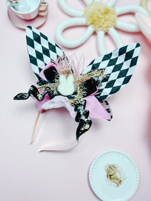 Unleash your inner whimsy with our Alice Oversize Bunny Ears. Made of luxurious wool fabric, these felted shapes are adorned with sparkling glitter, velvet ribbon, and tulle. A statement piece that will elevate any outfit, our fascinator is the perfect addition to your wardrobe for a touch of sophistication and charm.