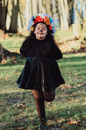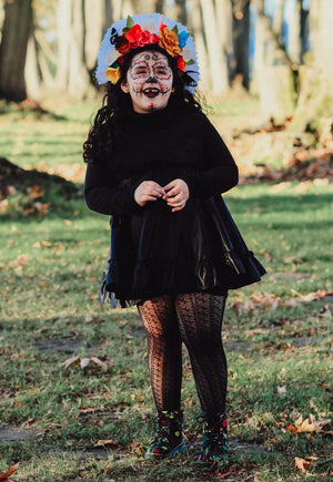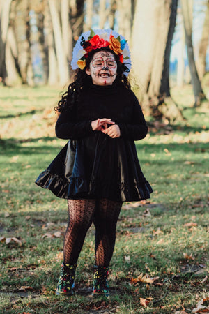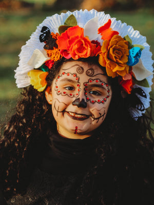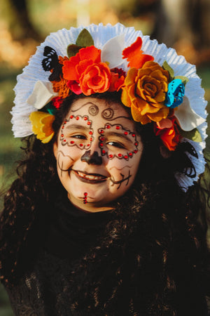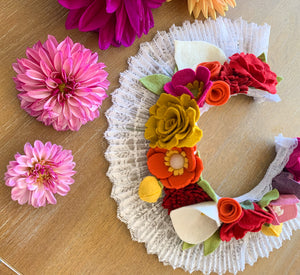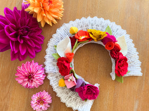 Introducing The Tehuana Crown: an exquisite, handmade headpiece crafted with wool felt that celebrates the colorful and vibrant culture associated with the Day of the Dead. This unique, blended felt adornment is a luxurious way to honor the sacred holiday and make a bold statement of beauty and style.