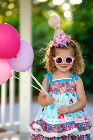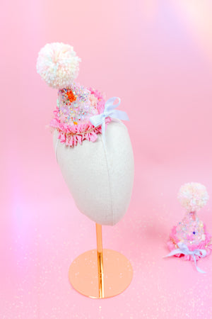"Add some sparkle to your party with our Get Your Party Started Hat! Made with wool felt and blended felt, featuring sequins, glitter, silk ribbon, and velvet ribbon. Perfect for birthdays and other celebrations. Don't be a party pooper, grab this hat!"
