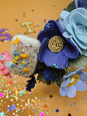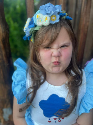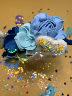 Brighten up any outfit with our Inspired Grumpy Side Floral Crown! Made of a wool felt blend, this headband features a unique blend of flowers and our favorite Care Bears character, Grumpy Bear. Perfect for adding a touch of playful charm to your look.
