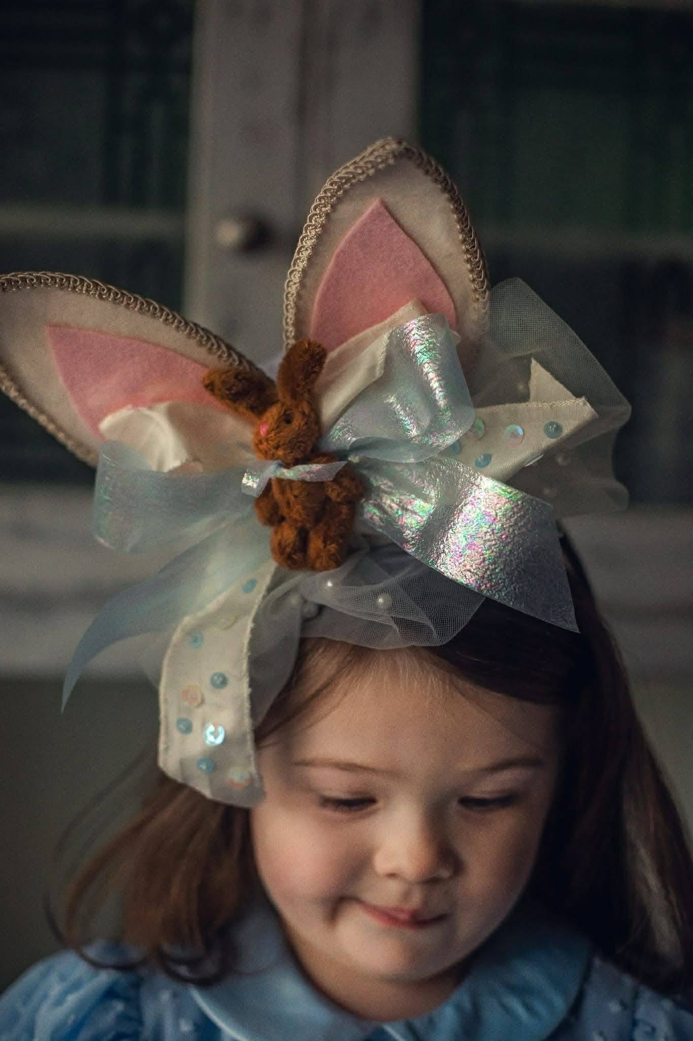 Blossoms by Marlena Presents a M2M fo Stella Maris, an exquisite couture headband featuring oversized felt bunny ears, designed for those who embrace theatrical elegance. This statement accessory seamlessly transitions from Easter celebrations to spring festivities, offering a whimsical yet refined touch to any ensemble. The meticulously crafted bunny ears fascinator combines playful charm with couture-quality construction, making it an ideal choice for special occasions, fashion-forward styling, or anyone seeking to make a memorable impression. Perfect for spring events and celebrations.