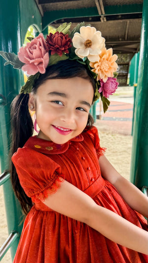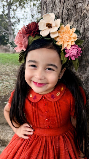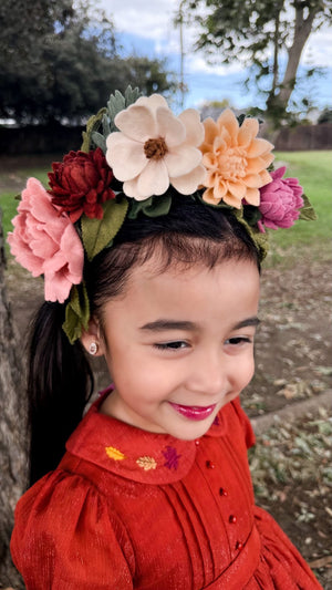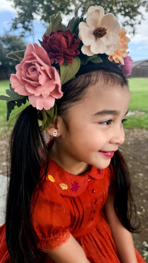 Add a whimsical touch to your look with this playful floral halo featuring felt roses, dahlias, cosmos, butterflies, and ranunculus, all nestled among lush greenery. Perfect as a bold statement piece, it brings a burst of nature-inspired charm and vibrant color to any outfit or occasion.