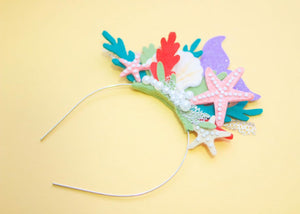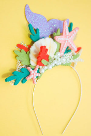 Suit up for any special occasion with this Under the Sea Inspired Fascinator! Handcrafted with wool blended felt, this stunning headband features two dainty little mermaids, ready to take you on a magical journey to the depths of the ocean. A perfect accessory to add some fanciful flair to any outfit! Dive in!